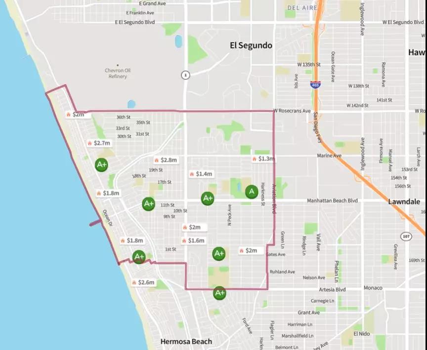 Manhattan Beach联合学区位于洛杉矶著名的海滨城市Manhattan Beach,这里位于好莱坞和洛杉矶市区的通勤范围,交通方便,风景好、学区好、名人聚集,近年很多名人选择到曼哈顿海滩市定居。